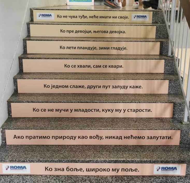 Stepenice, kojima đaci svakodnevno  prolaze, pokazale su se kao idealno rešenje za postavljanje ispisa sa pravilnim i nepravilnim izrazima, poslovicama, narodnim mudrostima, ali i veoma korisnim primerima iz matematike. Učenici OŠ „Vladimir Rolović“ takođe će imati prilike da svakodnevno obnavljaju i istorijske činjenice. Aristotel je rekao „Svaki čovek po prirodi teži znanju“, a Roma Company svojim Pametnim stepenicama nastoji da pruži deci znanje na kreativan i jedinstven način. Pored toga što će đaci brže i lakše učiti, edukativne stepenice služiće i kao podsetnik na već naučeno gradivo.