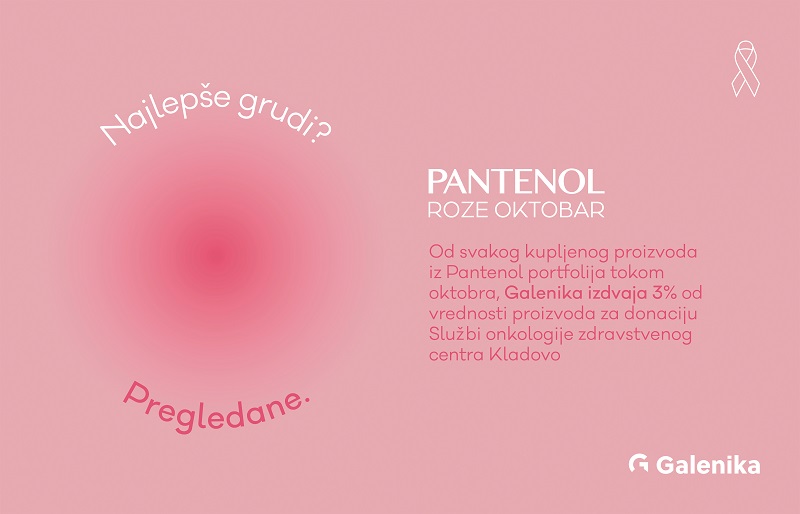 Misija kompanije Galenika i njenog brenda Pantenol i ove godine je u službi borbe protiv raka dojke. Tokom oktobra, meseca posvećenog borbi protiv raka dojke, Galenika peti put pruža aktivnu podršku i realizuje donatorsku akciju za zdravstvenu instituciju u Srbiji: od svakog kupljenog proizvoda iz Galenikinog Pantenol portfolija tokom oktobra, ova kompanija izdvaja 3% vrednosti proizvoda za ovu humanitarnu inicijativu.