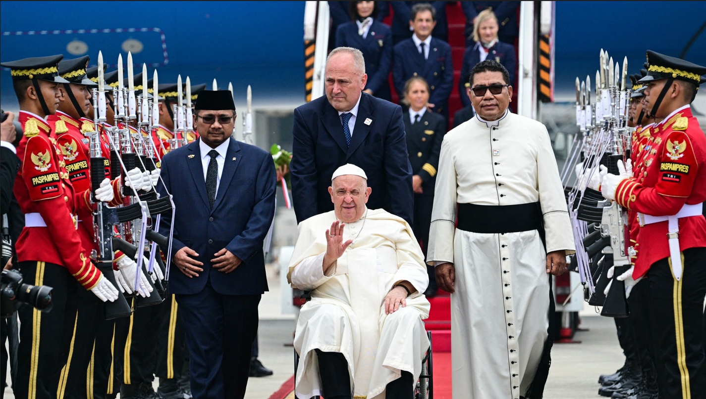 Papu muče bolovi u kolenu i leđima pa je na putovanju u invalidskim kolicima, a posle Indonezije posetće Papuu Novu Gvineju, Istočni Timor i Singapur, navodi Rojters.