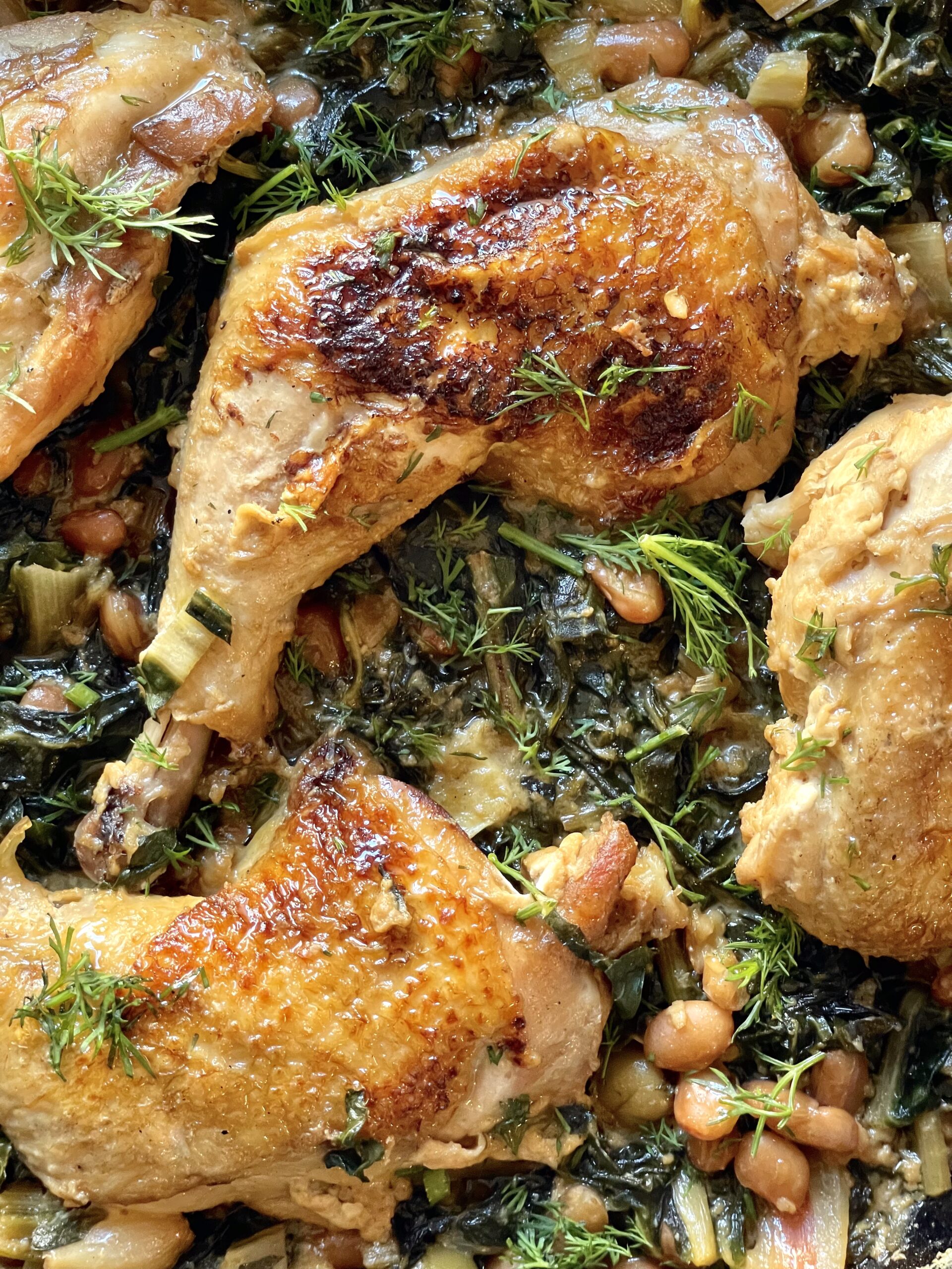 - Za to vreme naseći blitvu, i oprati pasulj iz konzerve. Nakon 40 minuta izvaditi piletinu iz tiganja na veliki tanjir i ubaciti blitvu i procedjen pasulj, promešati. Zatim vratiti piletinu odozgo i kuvati još 10 do 15 minuta da se sos ukuva, blitva smekša i ukusi sjedine. Skloniti sa vatre