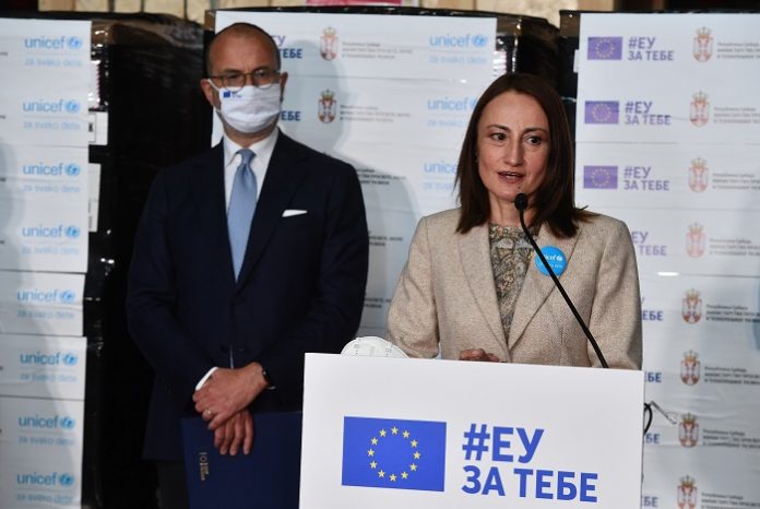 „Teška vremena produbljuju digitalni jaz. Po izbijanju pandemije, svet se brzo prebacio na onlajn obrazovanje. To za mnogobrojnu decu nije bilo moguće i dovelo ih je u dodatno otežanu situaciju. Jedan broj dece u Srbiji nije mogao da učestvuje u sistemu učenja na daljinu zbog nedostatka odgovarajuće opreme ili interneta tokom izbijanja pandemije. Zajedno sa Ministarstvom prosvete i u partnerstvu sa UNICEF-om, isporučićemo ukupno 2200 uređaja IT opreme koja je potrebna za organizovanje kontinuiranog i kvalitetnog učenja u škole u Srbiji, a koja će biti raspoređena na 30 škola i 250 pedagoških asistenata. Sva deca moraju da imaju jednake mogućnosti za pristup obrazovanju. Obrazovanje je ključno za njihov razvoj kao ličnosti i kao građana. EU podržava obrazovanje u Srbiji skoro 20 godina i nastaviće da pruža podršku. Nadam se da će ova oprema pomoći našim učenicima da ostvare sjajne rezultate u školovanju“, izjavio je ambasador Sem Fabrici i šef delegacije Evropske unije u Srbiji.