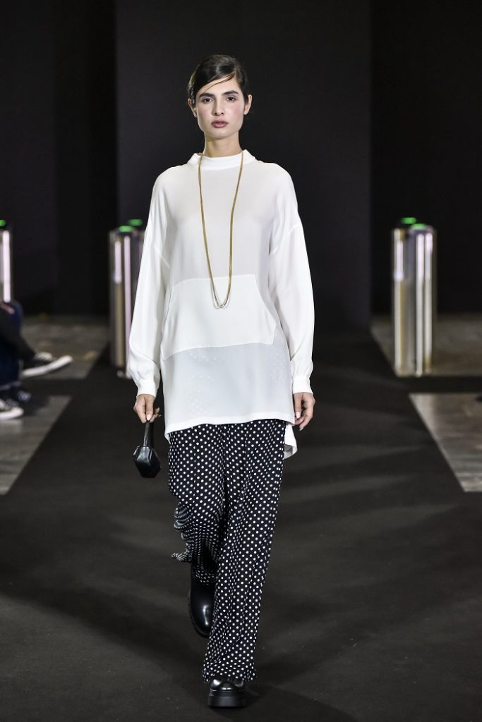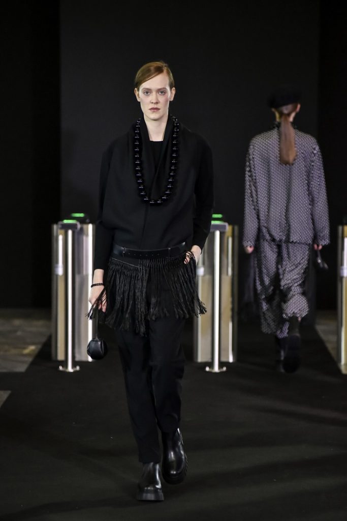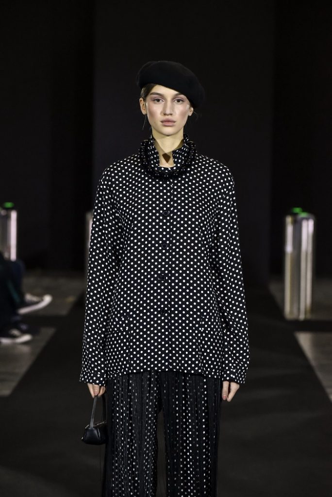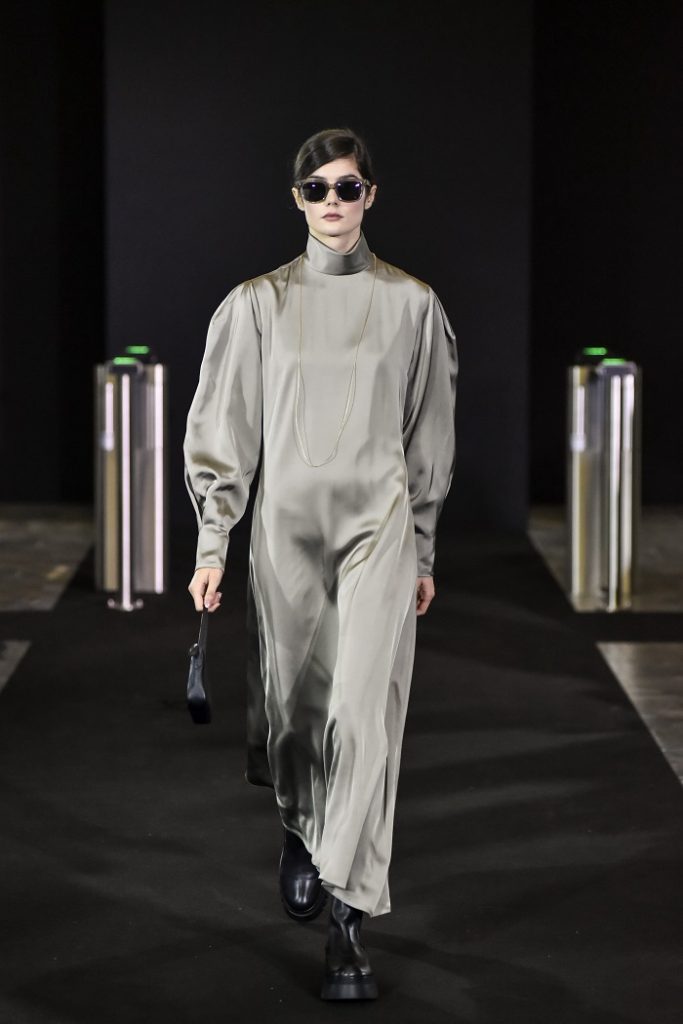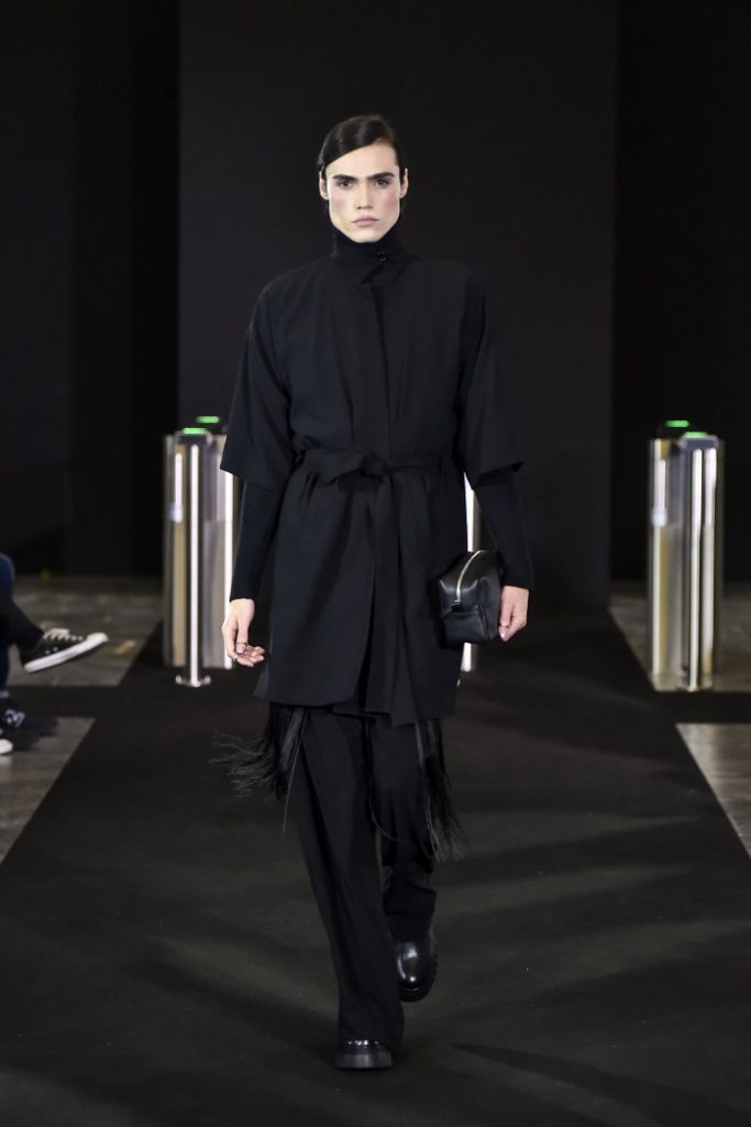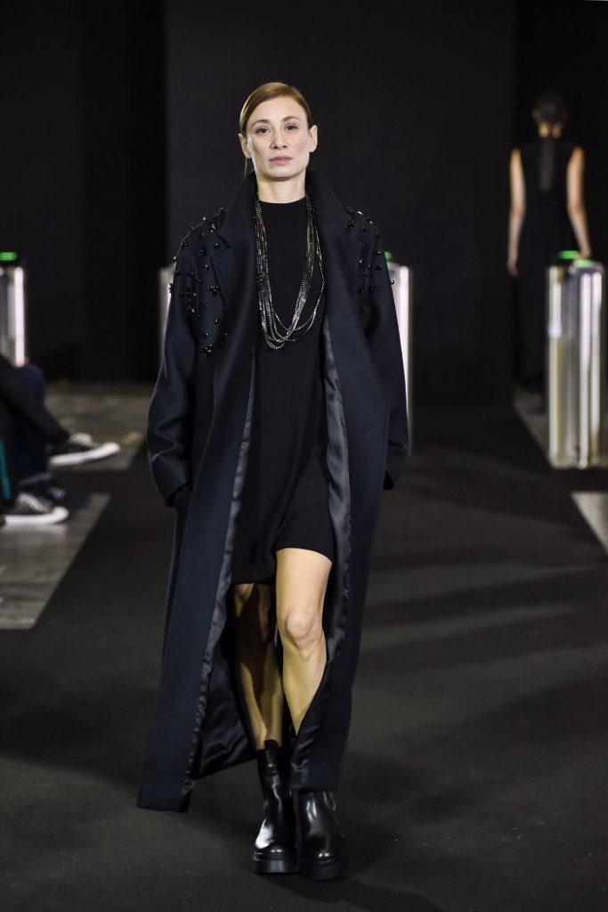 Nadaleko poznata po gracioznim kolekcijama koje odišu ženstvenošću, Dragana Ognjenović nam ove jeseni donosi kolekciju koju predstavljaju teksture delikatnih crnih perli i ornamenata na modelima, akcentovani šlicevi, koji se pojavljuju na šavovima, te siluete velikih komotnih kaputa koji reflektuju svilenkasti sjaj čvrstog satena u kontrastu sa gotovo industrijskim, metalnim rajsferšlusima kao rešenjem.