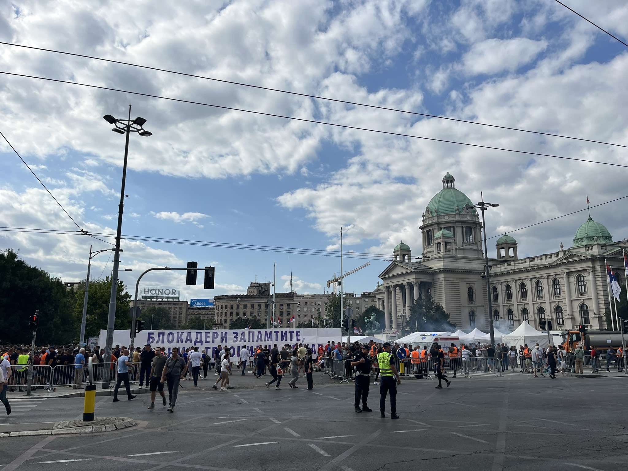 Ispred Skupštine je u petak postavljena bina, tamo je i više redova stolica za zvanice, dok su beli šatori dobili novi raspored u odnosu na onaj koji već mesecima zauzima prostor na kolovozu.