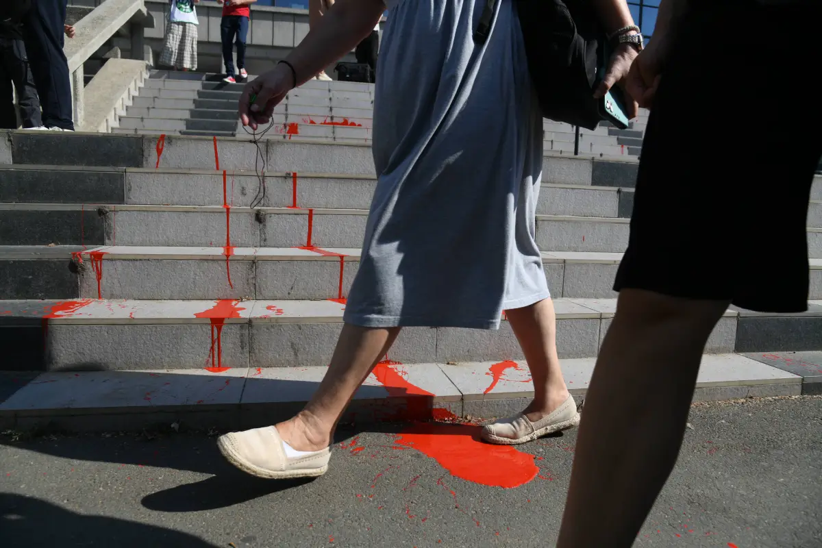 Prethodno se kolona zaustavila ispred Palate pravde, gde je u znak protesta prosuta crvena farba.