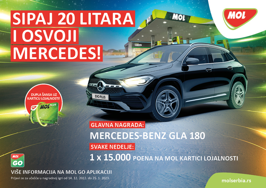 U duhu novogodišnje atmosfere i darivanja, kompanija MOL Serbia i ove godine pokrenula je nagradnu igru koja će trajati do 26. januara. Glavna nagrada je Mercedes-Benz GLA 180 koja će biti izvučena 27.januara, dok će svake nedelje kupci biti u prilici da osvoje jednu od šest nedeljnih nagrada – 15.000 poena na MOL Plus klub kartici lojalnosti.