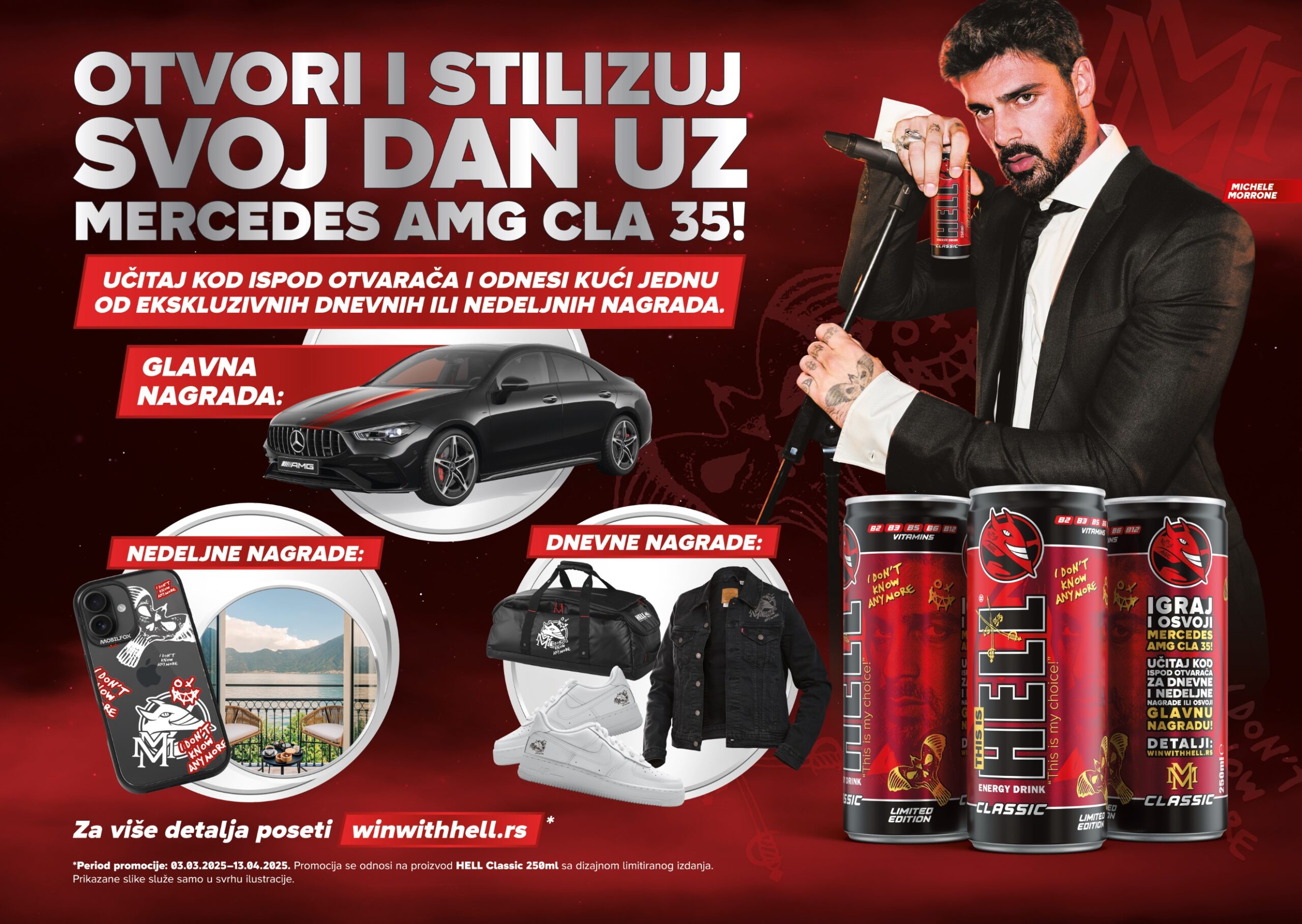 Tokom trajanja nagradne igre najpopularniji HELL proizvodi biće dostupni u ograničenom izdanju, u pakovanjima koja odražavaju atraktivne tetovaže Mikelea Moronea, čime se ljubiteljima ovog pića pruža prilika da sakupljaju jedinstveno dizajnirane limenke. Svaki kupljeni promotivni proizvod dovodi učesnike korak bliže osvajanju jedne od nagrada, uključujući i glavnu.