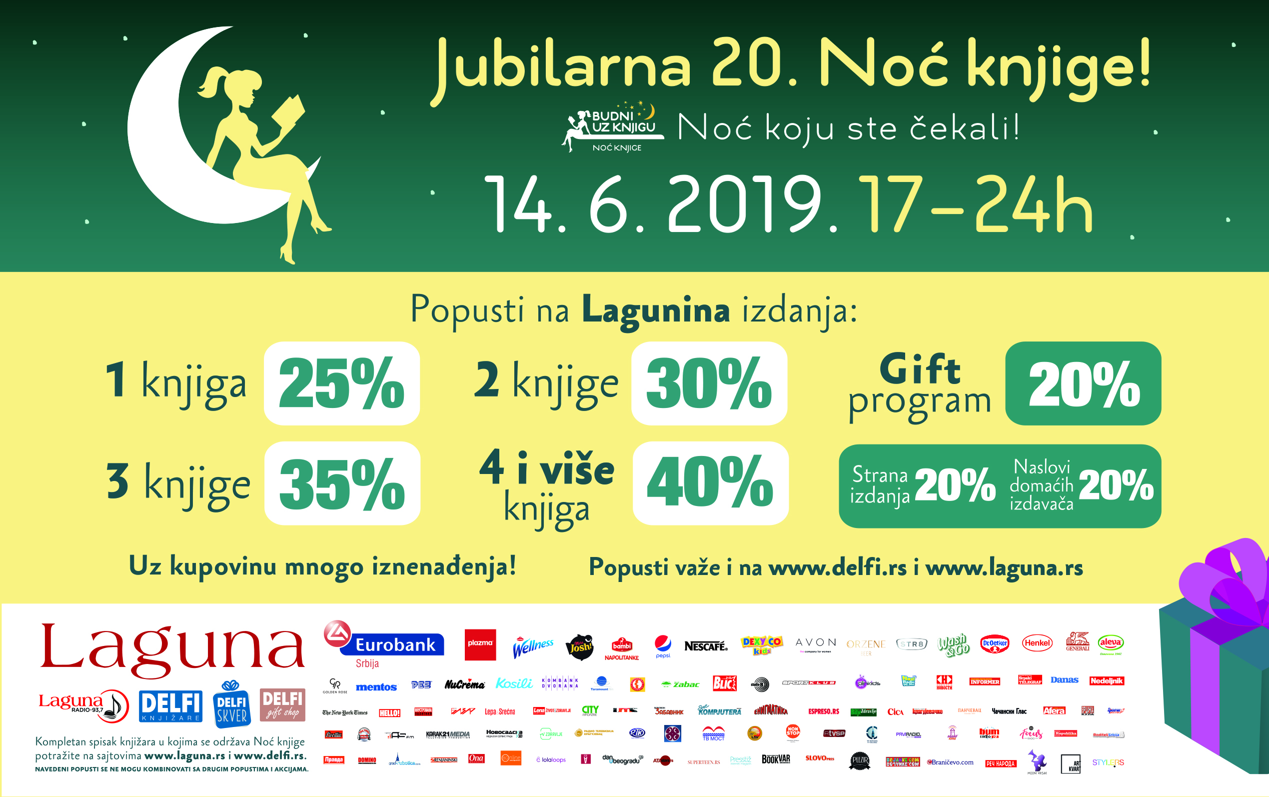„Noć knjige“je prilika da se po najpovoljnijim cenama kupe najnoviji svetski hitovi, knjige domaćih autora, knjige za decu i druga izdanja. I ovog puta, veliki broj pisaca družiće se sa čitaocima, a mnogobrojne biblioteke odobravaće popuste na članarinu i organizovati poseban program. Popust na knjige izdavača koji su se priključili „Noći knjige“kao i na strana izdanja i gift asortiman biće 20%. Za one koji ne stignu da posete knjižare, svi popusti moći će da se ostvare i na sajtovima www.laguna.rs i www.delfi.rs.