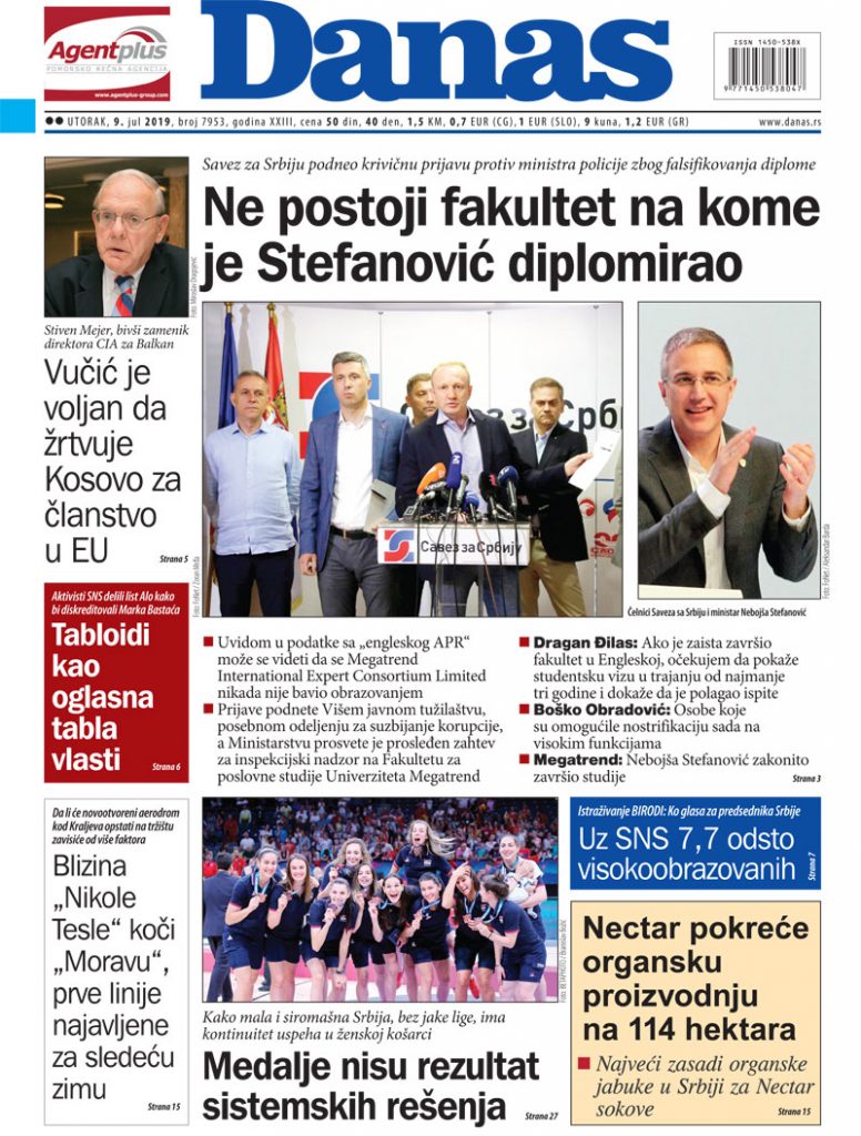 NEBOJŠA STEFANOVIĆ ODGOVORIO NA TUŽBE O FALSIFIKOVANJU DIPLOME; OGLASIO SE I MEGATREND – Ministar unutrašnjih poslova Nebojša Stefanović odbacio je optužbe lidera Saveza za Srbiju da je falsifikovao diplomu fakulteta, nazivajći ih notornim lažima i izmišljotinama kojima, kako je rekao, Dragan Đilas pokušava da skrene pažnju javnosti sa ozbiljne korupcije u koju je upleten.