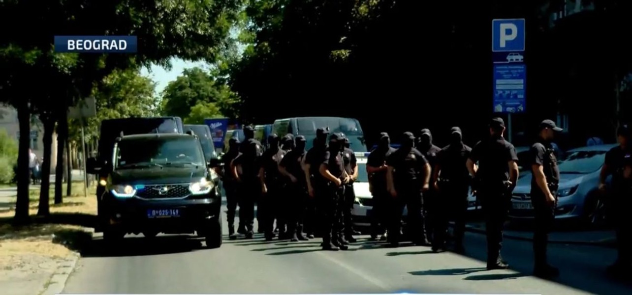 Žandarmerija i pripadnici drugih policijskih jedinica potiskuju građane sa blokade koji se podignutih ruku povlače.
