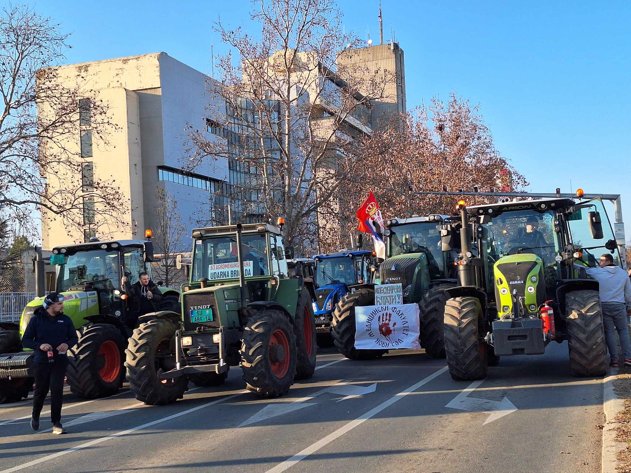 Traktori su i dalje ispred opštinske zgrade u Karađorđevoj ulici u Rači, koja je danonoćno blokirana od 30. januara, kada su propali pregovori poljoprivrednika sa opštinskim rukovodiocima za vraćanje poreza na imovinu na prošlogodišnji nivo.