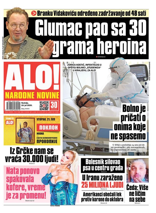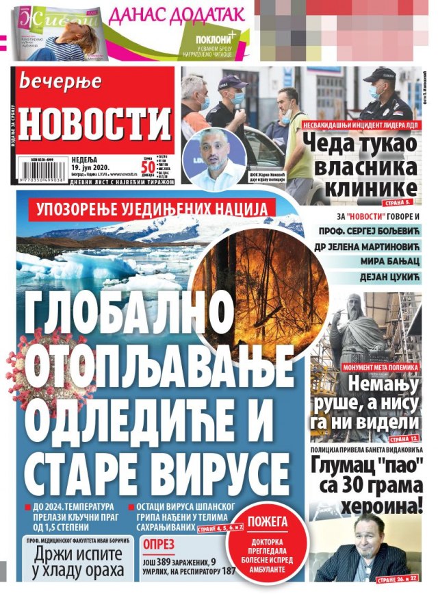 VEČERNJE NOVOSTI – „Globalno otopljavanje odlediće i stare viruse“, o upozorenju Ujedinjenih nacija zbog globalnog zagrevanja. „Glumac ‘pao’ sa 30 grama heriona“, o privodjenju glumca Baneta Vidakovića.
