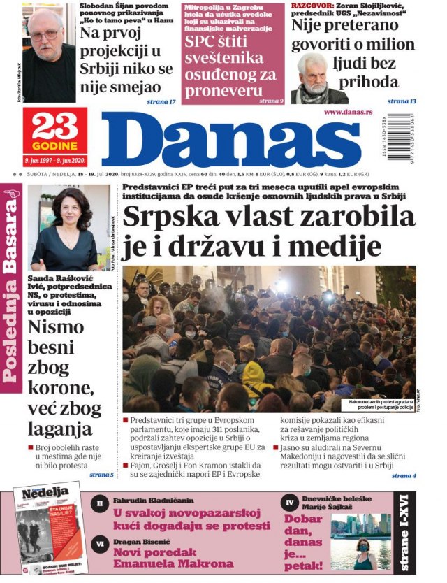 NASLOVNE STRANE DNEVNIH NOVINA – Dnevni listovi na naslovnim stranama izdanja za nedelju, 19. jul 2020. godine, pišu o pandemiji korona virusa, njenim posledicama i o drugim temama.