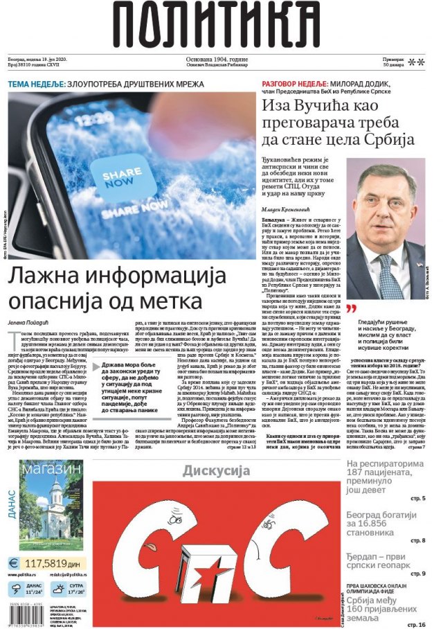 POLITIKA – „Lažna informacija opasnija od metka“, list piše o zloupotrebama društvenih mreža. „Iza Vučića kao pregovarača treba da stane cela Srbija“, razgovor sa članom predsedništva Bosne i Hercegovine Miloradom Dodikom.