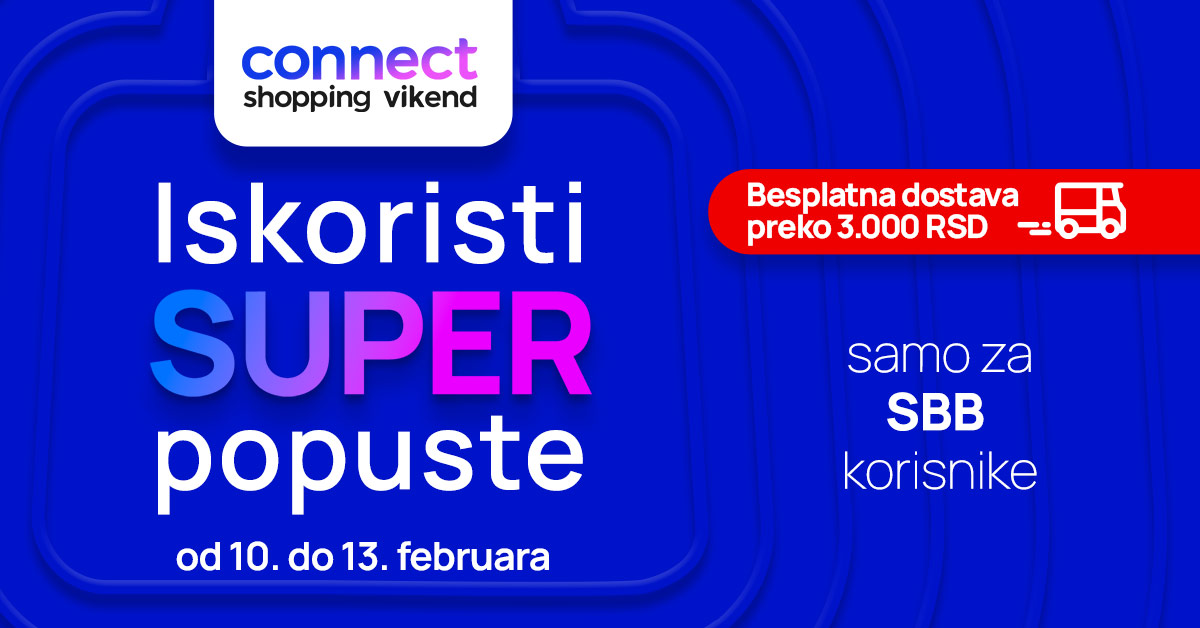 SBB kompanija i Shoppster najavili su dodatne popuste od danas do nedelje za sve SBB korisnike u okviru Connect Shopping vikenda, uz besplatnu dostavu na kupovinu iznad 3.000 dinara na ceo asortiman.