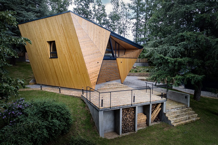 Nekadašnja geometrija u vidu trostrane prizme je umnožena, sa smicanjima po horizontalnim osama, kako bi se iskoristio postojeći predimenzionisani temelj, ali i objekat prilagodio karakteristikama lokacije. Kuću nosi skelet od čeličnih profila, ispunjen termoizolacijom, a spolja i iznutra obložen čamovim drvetom. Primenom drvene obloge ostvaren je topao ambijent, a eksterijer, uprkos strogoj geometriji koja je u kontrastu s prirodom, skladno je uklopljen u prirodno okruženje.