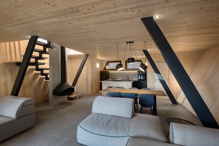 U enterijeru preovlađuje drvo, od kojeg su izrađeni zidovi i plafoni, sa kontrastnim elementima u antracit sivoj i crnoj boji, kao što su kosnici, stepenište, kuhinjski elementi, viseći kamin, prozori i rasveta.