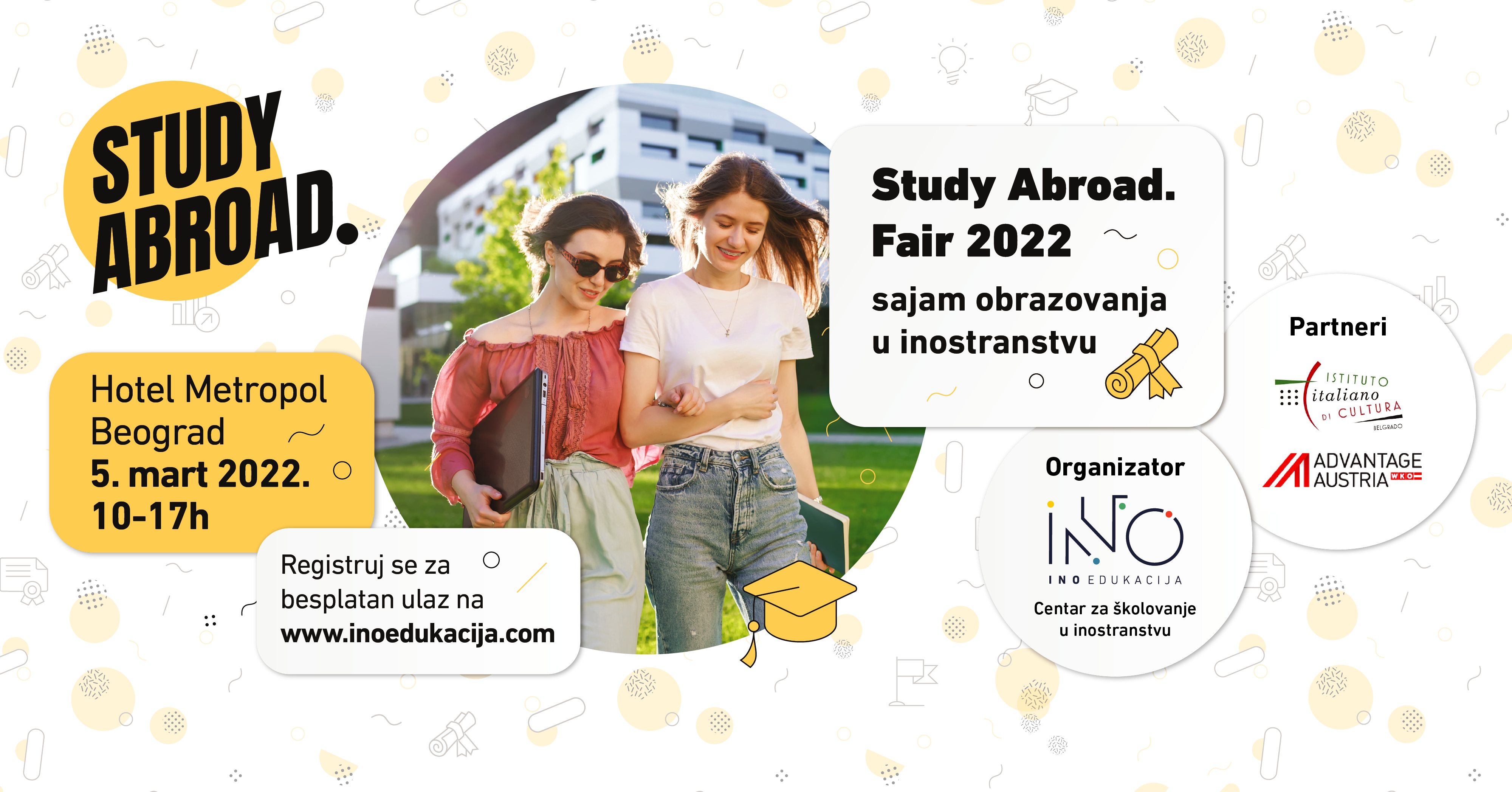 Study Abroad. Fair 2022 spring edition namenjen je srednjoškolcima, studentima i roditeljima i na njemu će se predstaviti srednje škole iz inostranstva, srednjoškolske razmene u Americi, škole jezika i fakulteti iz inostranstva, kroz svoje štandove u velikoj sali hotela Metropol. Na licu mesta od predstavnika različitih obrazovanih institucija iz inostranstva posetioci će moći da pitaju sve što ih zanima i saznaju koje programe i stipendije nude, te da svako pronađe tip programa koji mu najbolje odgovara.
