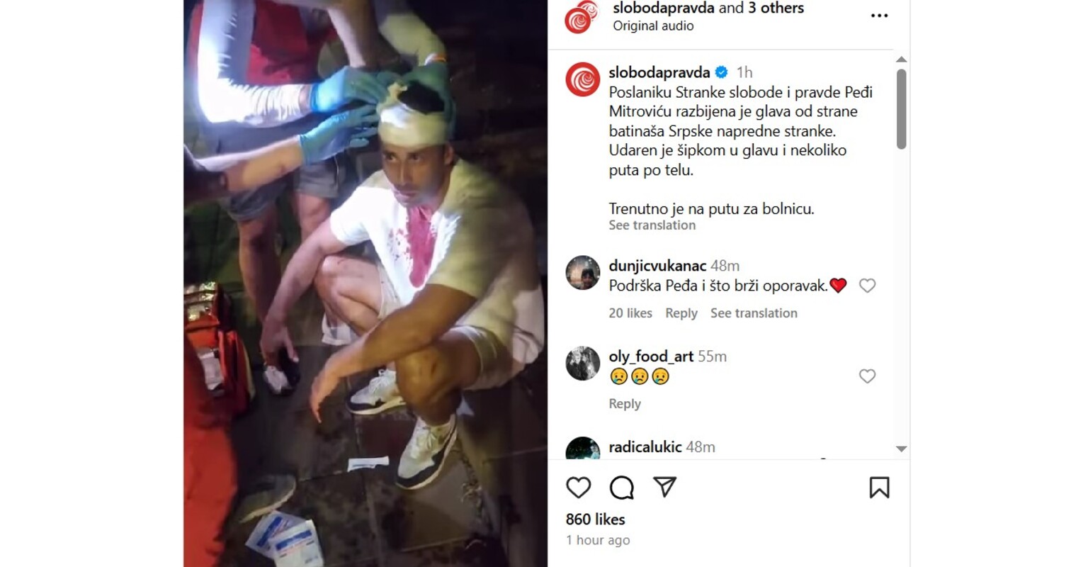 „Poslaniku Stranke slobode i pravde Peđi Mitroviću razbijena je glava od strane batinaša Srpske napredne stranke. Udaren je šipkom u glavu i nekoliko puta po telu. Trenutno je na putu za bolnicu“, objavio je SSP.