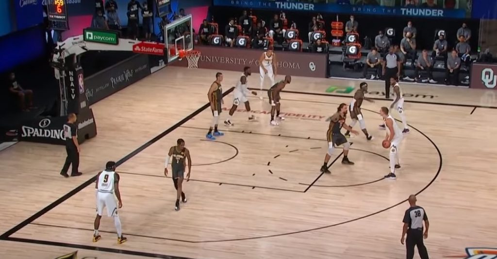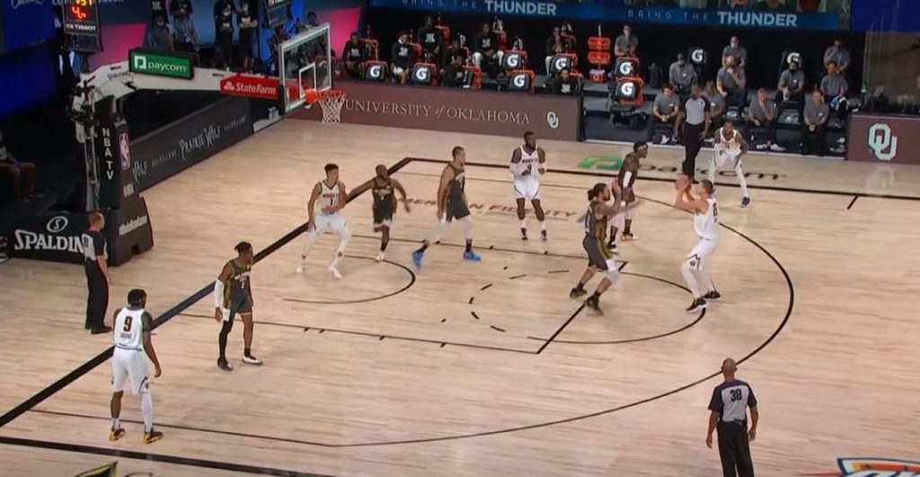 1. Jokić zamišljen drži loptu i praveći se da je odlutao posmatra kretnje igrača na terenu