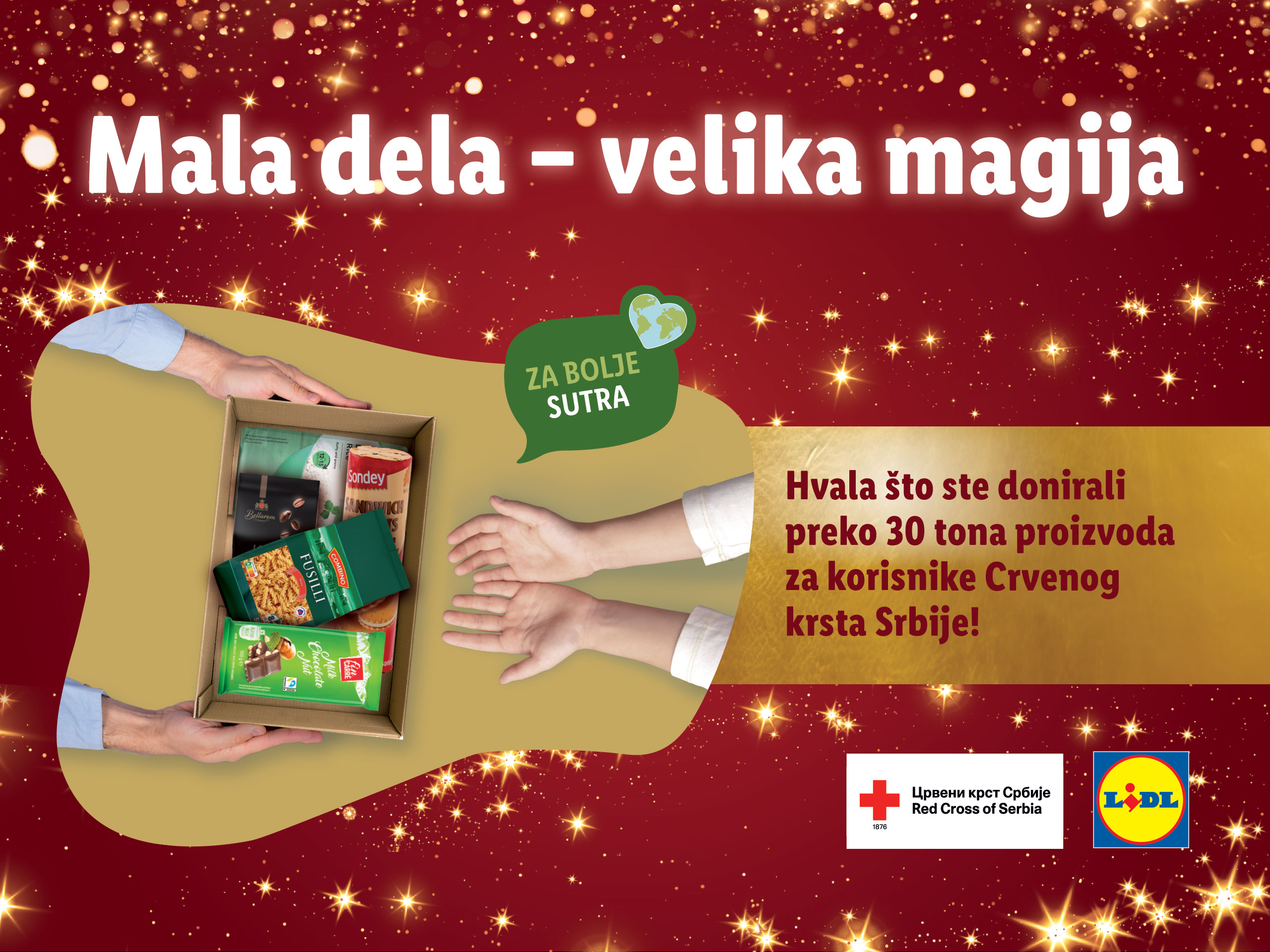 Kompanija Lidl Srbija je, uz pomoć svojih potrošača, u okviru tradicionalne praznične kampanje „Mala dela – velika magija“ donirala sredstva u ukupnom iznosu od 6.300.000 RSD korisnicima Crvenog krsta Srbije. Kupovinom preporučenih proizvoda i njihovim odlaganjem na predviđeno mesto iza kasa Lidl prodavnica, potrošači su donirali namirnice u vrednosti od 4.500.000 RSD. Dodatno, Lidl je u okviru novogodišnje kampanje u asortiman uvrstio i limitiranu seriju plišane igračke rakuna Raše, i za svakog kupljenog rakuna obezbedio po 100 RSD Programu narodnih kuhinja Crvenog krsta Srbije.