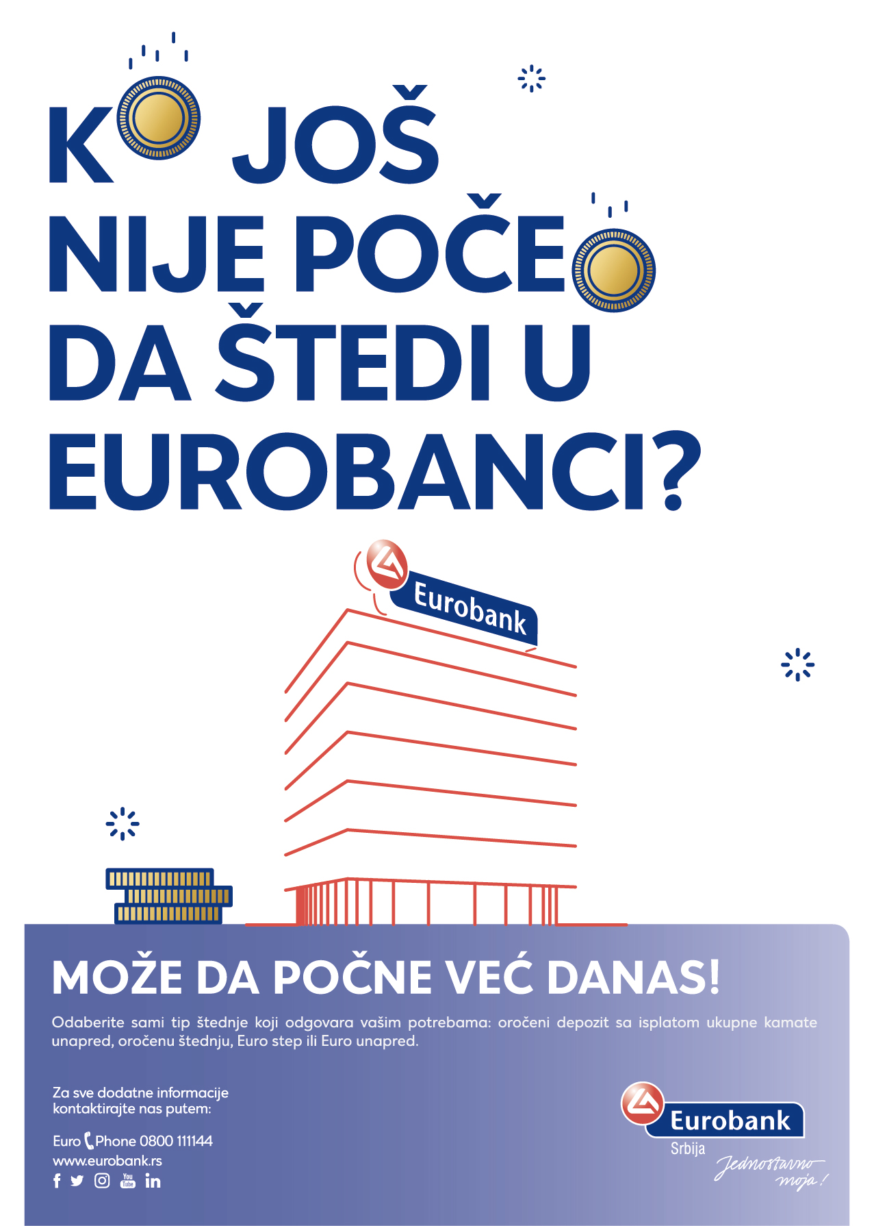 Osnovne informacije o štednji pronađite na sajtu banke, posetite neku od 80 Eurobank ekspozitura širom Srbije ili pozovite besplatni korisnički servis EuroPHONE na broj: 0800 1111 44.