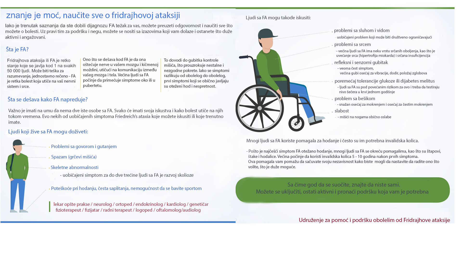 Udruženje za pomoć i podršku obolelim od Fridrajhove ataksije je osnovano 2010. godine sa ciljem da poboljša kvalitet života pacijenata sa Friedreichovom ataksijom i njihovih porodica. Okuplja 15 pacijenata sa ovom retkom neurodegenerativnom bolešću.