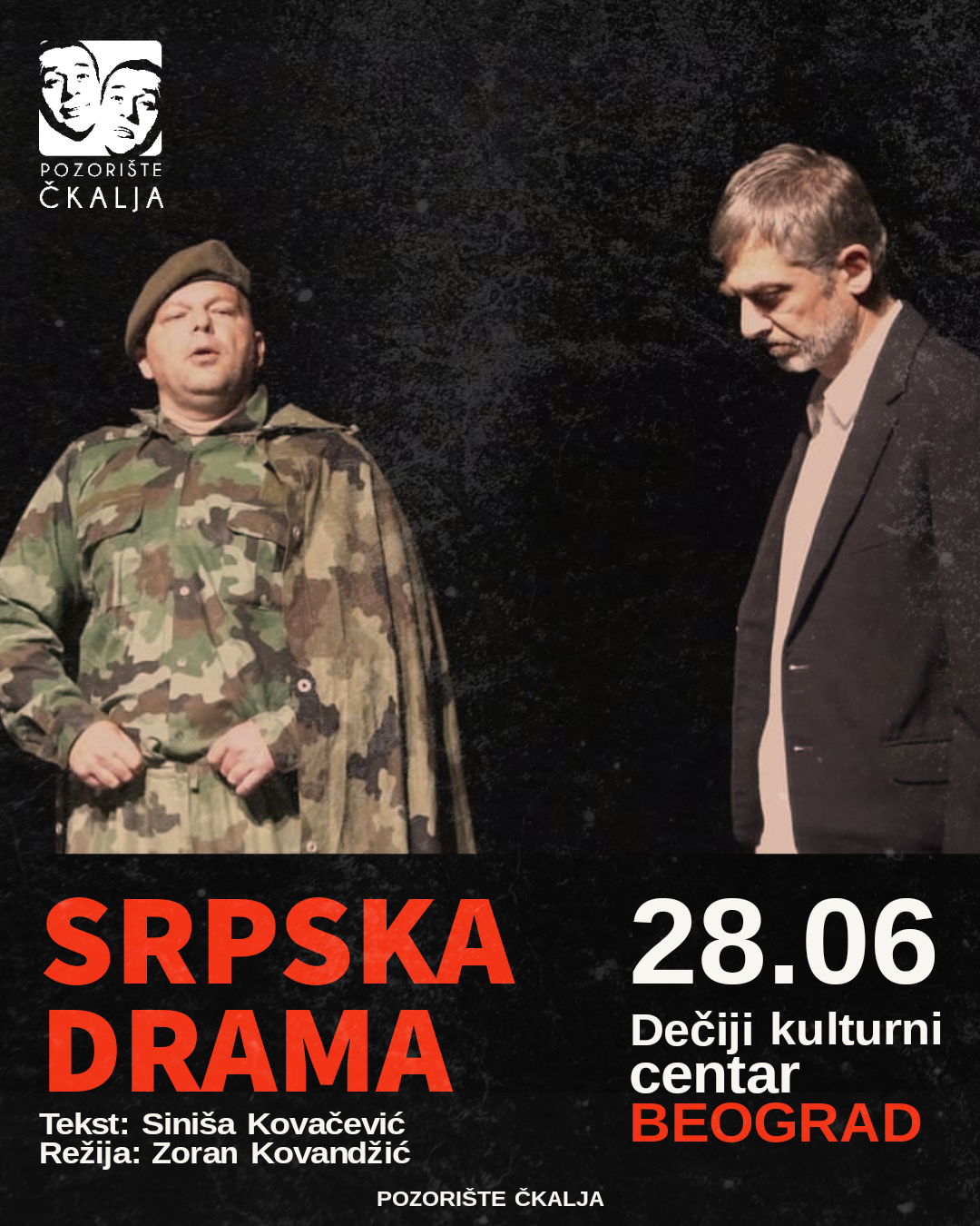 Predstava „Srpska drama“ je aktuelizovana verzija najpoznatijeg dramskog dela Siniše Kovačevića i igra se, simbolično na Vidovdan, 28.06.2023. godine, u dvorani Dečijeg kulturnog centra u Beogradu u 20h.