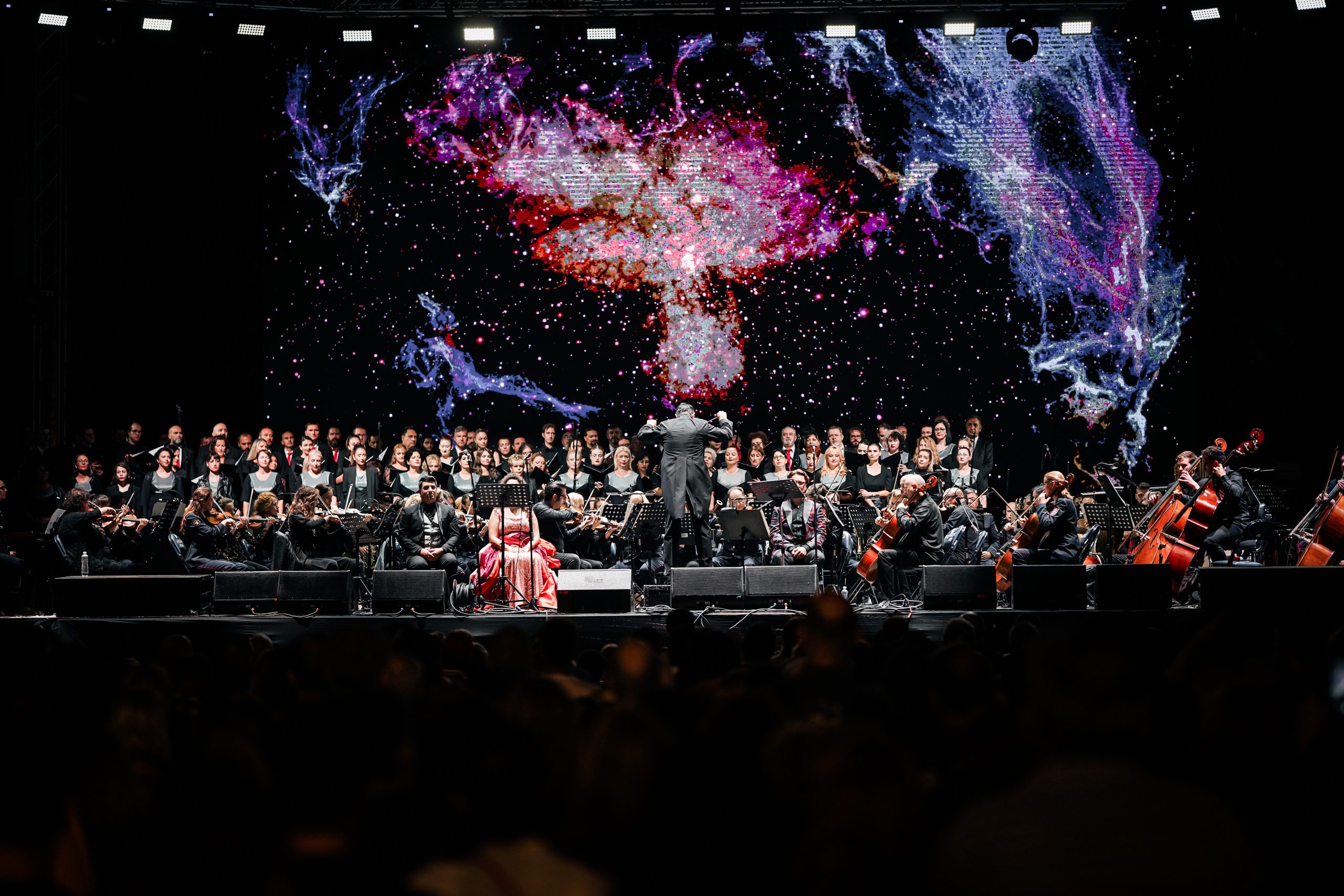 Već oko 20 časova na Ušću se okupilo preko 10.000 ljudi, iščekivajući izvedbu više puta pomeranu zbog vremena – kantatu „Karmina Burana“. Na impozantnoj bini jedno od najpoznatijih klasičnih dela u istoriji izvelo je više od 300 muzičara, hora i orkestra Srpskog narodnog pozorišta i Umetničkog ansambla Stanislav Binički“, kojima je dirigovao maestro Aleksandar Kojić, dok su solisti bili sopran Marija Jelić, tenor Stevan Karanac i bariton Vasa Stajkić