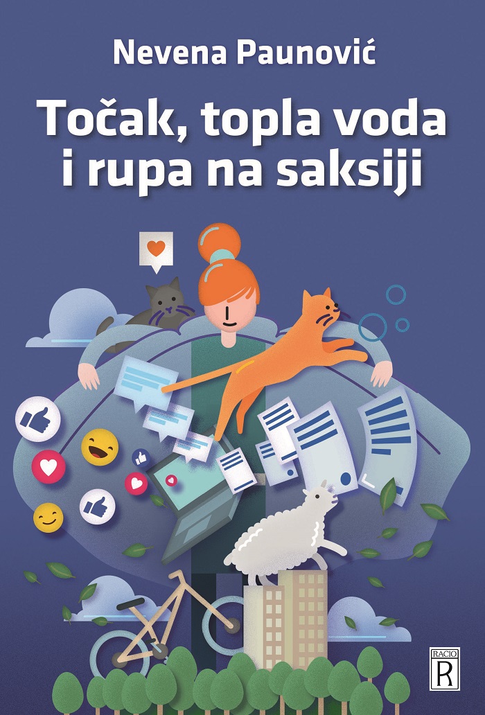 Najnovije izdanje izdavačke kuće RACIO, “Točak, topla voda i rupa na saksiji” predstavlja svojevrsni eksperiment prebacivanja sadržaja sa društvenih mreža u književnu formu. Knjiga se sastoji od autorkinih objava na Fejsbuku nastalih u periodu od 2014. do 2021. godine, koje prate život jedne obrazovane, kreativne, sposobne žene u tridesetim godinama u Srbiji, koja u ovom društvu sama sebi izgleda neprilagođena, namrgođena i smotana. Ona na duhovit način dokumentuje svoj put od prekarne (ili kako sama tvrdi “lečene”) radnice u kulturi do rada u onlajn okruženju u okviru rastuće armade frilensera. O svemu što doživljava na tom putu Nevena glasno razmišlja, u formi kraćeg proznog teksta za lajkovanje, komentarisanje i deljenje.
