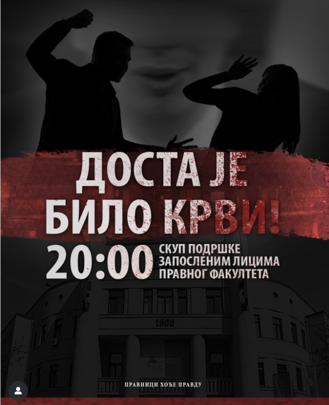 Protest nosi naziv „Dosta je bilo krvi“ i za cilj ima iskazivanje podrške zaposlenima na Pravnom fakultetu u Beogradu.