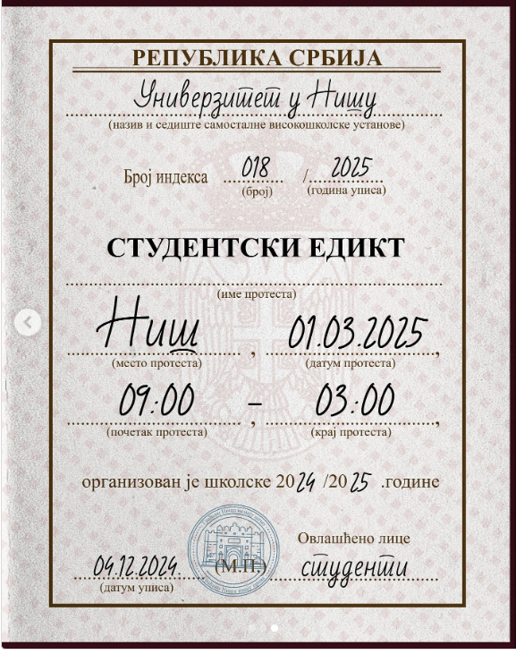Dođi u Niš, dođi na najmasovniji protest u istoriji carskog grada, 1. marta. Ovo je naš edikt – naša odluka da ne odustajemo!