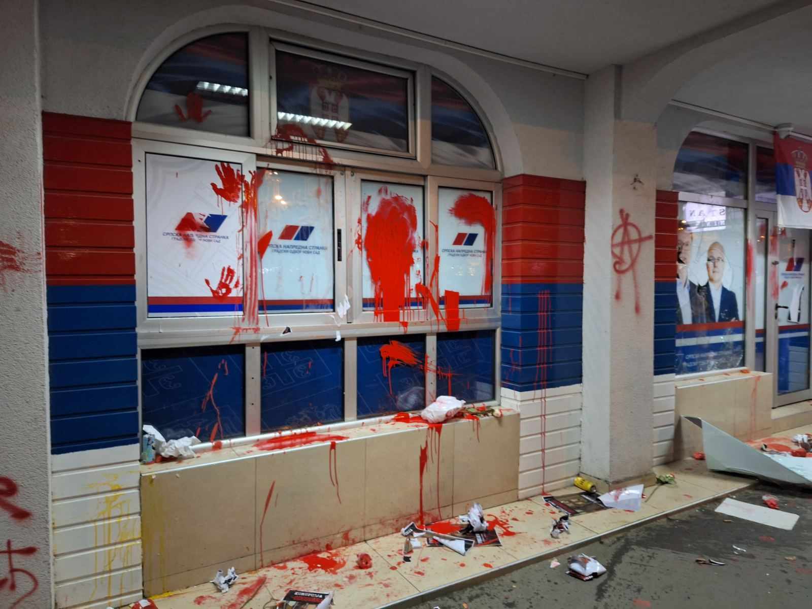 Oni su tom prilikom zastali i zviždali. Posle nekoliko minuta su prišli vratima i počeli da skidaju zastave Srbije okačene na ulazu u prostorije, a potom su i prosuli crvenu farbu.