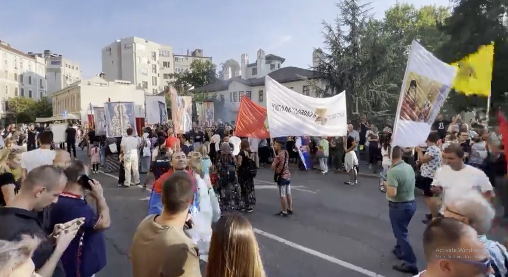 Sa razglasa se puštaju duhovne pesme, a nose se zastave Srbije i transparenti s likovima svetaca.