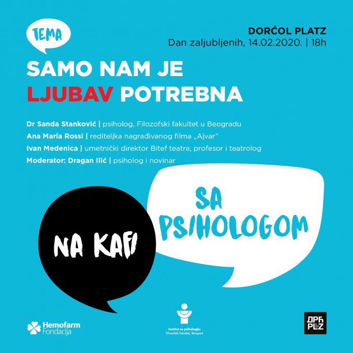 Nakon velikog uspeha u prethodnoj sezoni, novi ciklus tribina Hemofarm fondacije pod nazivom „Na kafi sa psihologom” nastavljamo ovog februara. Simbolično na Dan zaljubljenih, seriju razgovora sa psihologom otvara tema ljubavi, a o značaju emocija za život pojedinca govoriće dr Sanda Stanković, psiholog na Filozofskom fakultetu u Beogradu, Ana Maria Rossi, rediteljka nagrađivanog filma „Ajvar” i Ivan Medenica, umetnički direktor Bitefa, profesor i teatrolog uz domaćina tribine Dragana Ilića, psihologa i novinara nedeljnika „Vreme“.