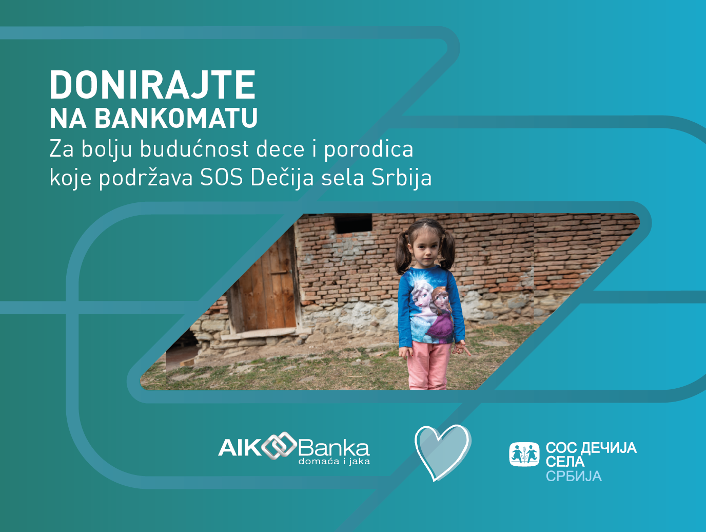 Bankomati AIK Banke su od danas prvi bankomati u Srbiji na kojima svi klijenti ove Banke, uz već uobičajene uplate i isplate novca, uvid u stanje i druge servise, sada mogu da uz samo par klikova uplate svoju donaciju humanitarnoj organizaciji SOS Dečija sela Srbija.