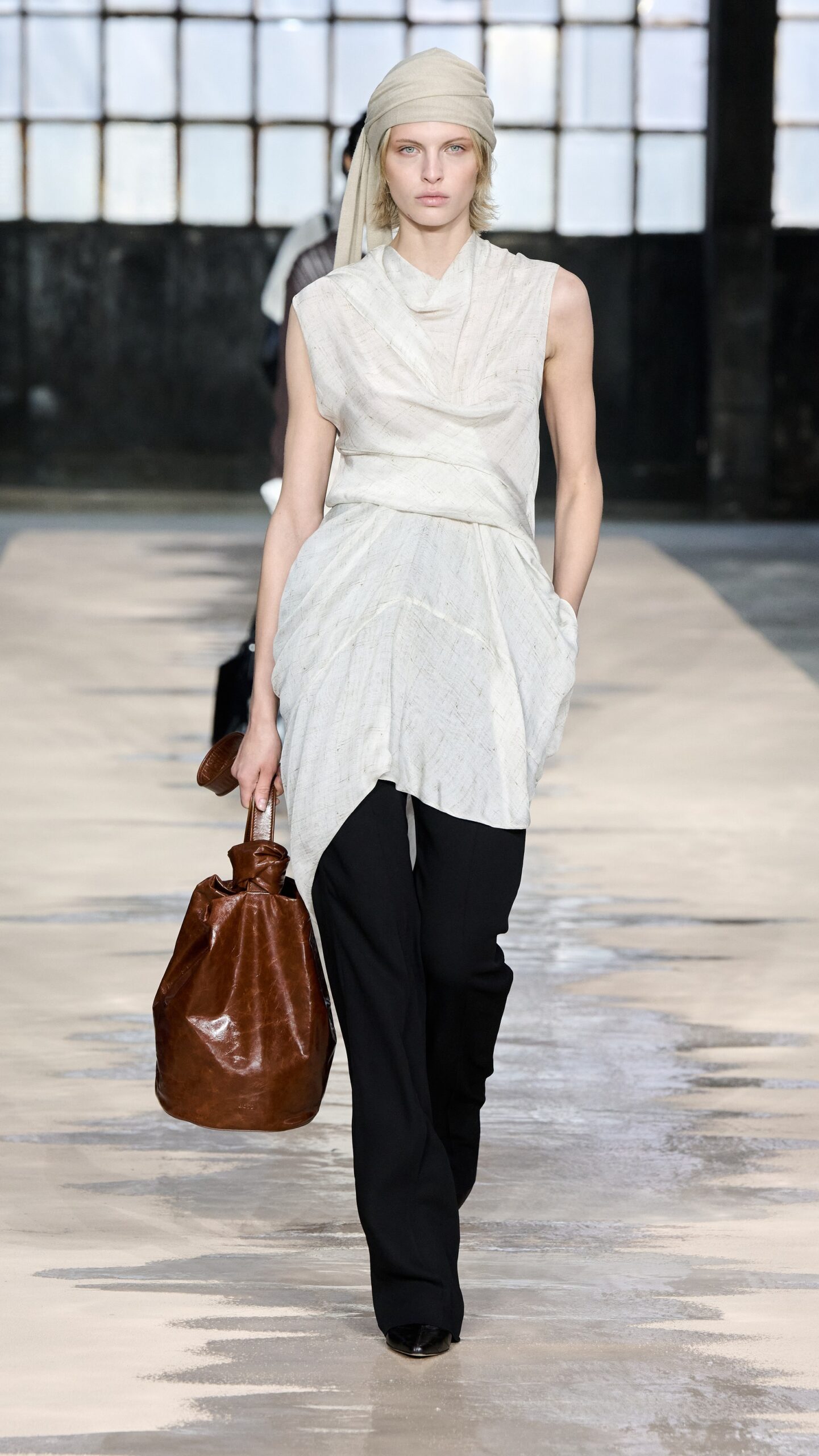 Jedan od ključnih modela je maksi košulja sa širokim rukavima i naglašenim strukom, uparena sa laganim pantalonama ravnog kroja koje pružaju eleganciju pokreta. Haljine sa geometrijskim izrezima, pantalone neuobičajenih proporcija i praktični elementi poput kapuljača ili asimetričnih zatvaranja osnažili su vizuelnu priču.