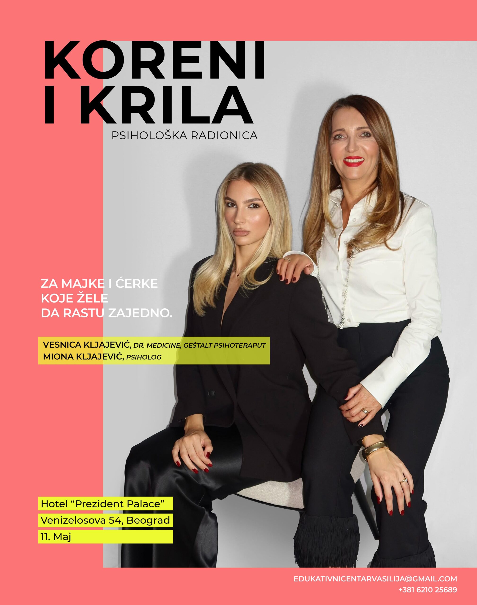 Kroz ovaj proces, zajedno će stvoriti nove temelje za odnos koji će biti zasnovan na poverenju, poštovanju i slobodi. Naziv radionice, “Koreni i krila”, simbolizuje ono što svako dete dobija od svoje majke – stabilnost, pripadnost i ljubav (koreni), kao i snagu, podršku i slobodu da krene svojim putem (krila). Ova radionica pruža jedinstvenu priliku da se stvori zdrav i slobodan odnos između majke i ćerke, temeljen na razumevanju, poštovanju i međusobnoj podršci.