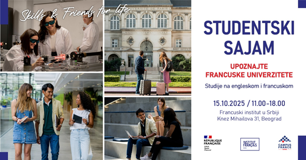 U sezoni obrazovnih sajmova održava se 16. PUTUJUĆI STUDENTSKI SAJAM: UPOZNAJTE FRANCUSKE UNIVERZITETE u sredu 15. oktobra 2025. od 11.00 do 18.00 časova u prostorijama Francuskog instituta u Srbiji, Knez Mihailova 31. Ovaj datum je i početak kampanje za dodelu stipendija Vlade Republike Francuske za Master 2 i doktorate u ko-mentorstvu za akademsku 2026/2027.