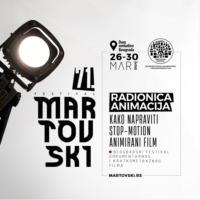 Martovski festival poziva mlade na besplatnu radionicu KAKO NAPRAVITI STOP MOTION ANIMIRANI FILM, koju vode Ana Nedeljković i Nikola Majdak mlađi. Radionica će biti održana tokom trajanja 71. Martovskog festivala u Domu omladine Beograda, a zainteresovani za prijavu ne moraju imati prethodno iskustvo u animaciji.