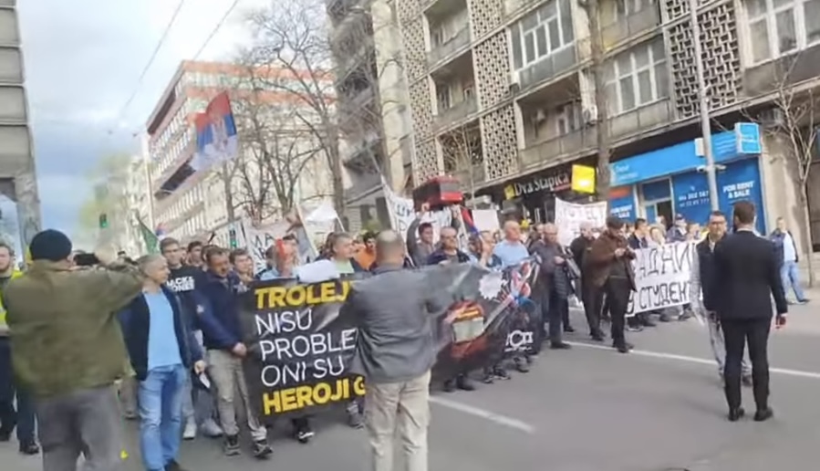 Nose transparente sa natpisom „Trolejbusi nisu problem, oni su heroji grada“, „Radnici su uz studente“ i „Nema spavanja pred istinom“.