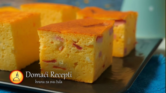 Podmazati pleh uljem i posuti brašnom, sipati smesu i peći na 200°C oko 30 – 35 minuta.