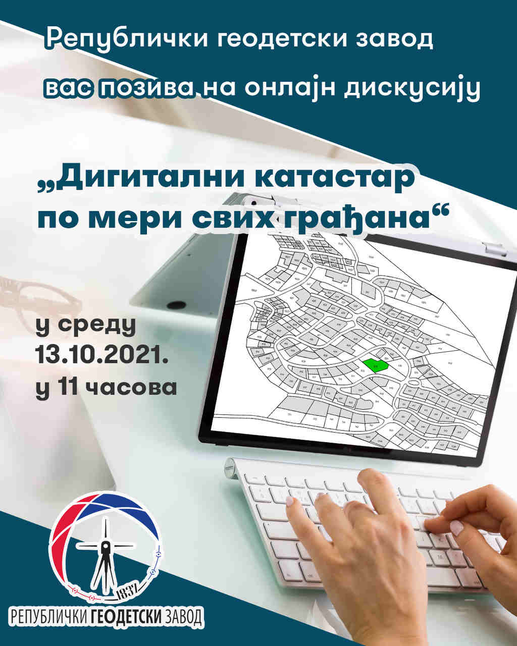 Republički geodetski zavod organizuje, prvu u nizu, onlajn diskusiju „Digitalni katastar po meri svih građana“, u sredu 13. oktobra 2021. sa početkom u 11 časova. RGZ želi da pomogne građanima da bolje razumeju i efikasnije koriste njihove digitalne usluge, servise i aplikacije, kao i da odgovore na sva pitanja i nedoumice.