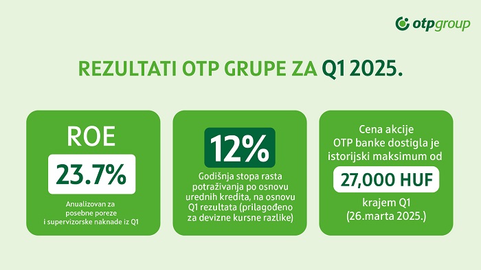 U prvom kvartalu 2025. godine, profit OTP Grupe nakon oporezivanja iznosio je 189 milijardi forinti, odnosno 466 miliona evra, što je u skladu sa povratom na kapital od 14,9%.