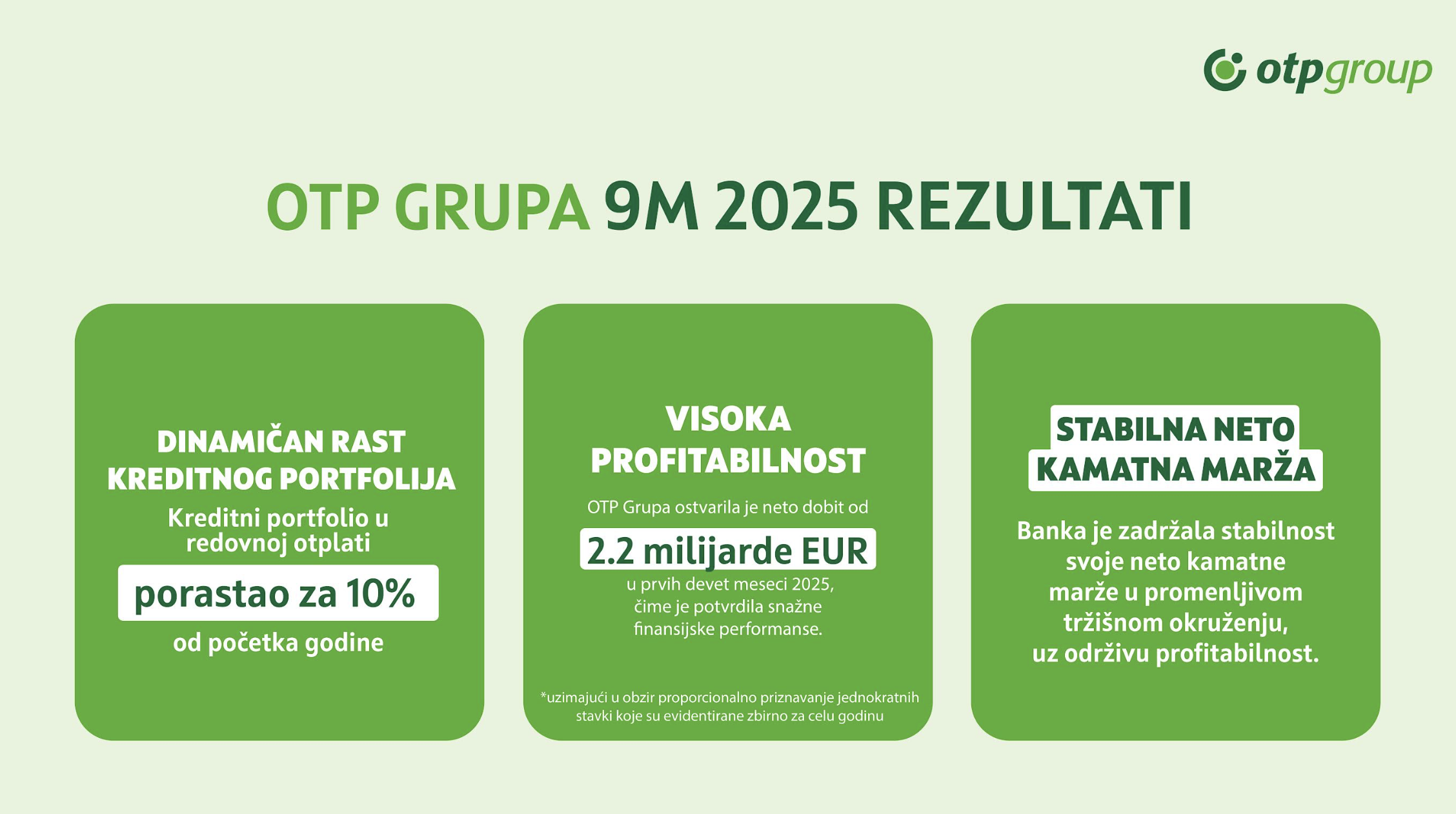 U prvih devet meseci 2025. godine OTP Grupa je ostvarila izvanredne rezultate i potvrdila snažne finansijske performanse. Od početka godine ostvarena je kumulirana dobit nakon oporezivanja u iznosu od 86 milijardi forinti, odnosno 2,2 milijarde evra i ROE od 22,7%, uz ravnomerno priznavanje posebnih rashoda (specijalni bankarski porezi u Mađarskoj, nadzorni izdaci u Bugarskoj, Mađarskoj i Sloveniji) proknjiženih na početku godine u ukupnom iznosu za celu godinu.