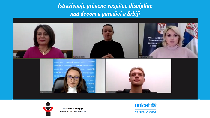 UNICEF je danas, u saradnji sa Ministarstvom za rad, zapošljavanje, boračka i socijalna pitanja, predstavio nalaze Istraživanja o znanju, stavovima i praksama u vezi sa primenom vaspitne discipline nad decom u porodici u Srbiji. Istraživanje su za UNICEF sproveli Institut za psihologiju i Institut za mentalno zdravlje.