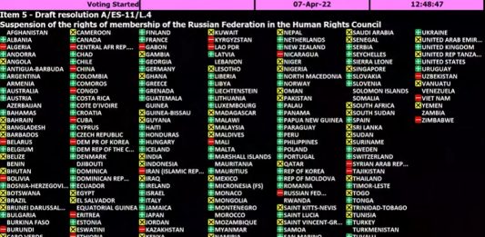 Generalna skupština Ujedinjenih nacija izglasala je suspenziju Rusije iz Saveta za ljudska prava zbog izveštaja o „grubim i sistematskim kršenjima i zloupotrebama ljudskih prav““ invazijom ruskih trupa u Ukrajini. Oko 93 zemlje glasale su za predlog predvođen SAD, dok su 24 zemlje glasale protiv, a 58 zemalja je bilo uzdržano. Među zemljama koje su glasale … Nastavi sa čitanjem Srbija glasala „za“, Kina protiv: Rusija suspendovana iz Saveta UN za ljudska prava