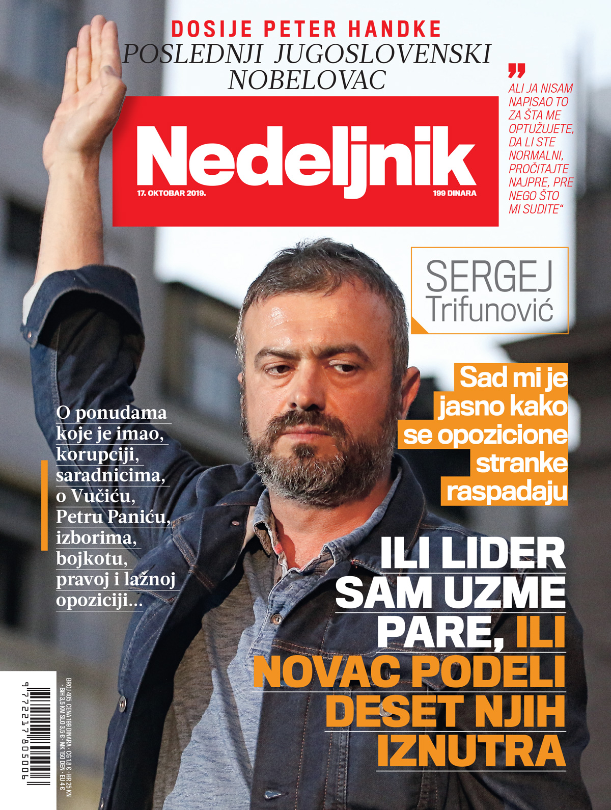 Popularni glumac koji, od kada je postao jedan od vođa opozicije, ne dobija aplauz za svaku odigranu ulogu, govori za Nedeljnik – svojim sada već prepoznatljivim političkim, na momente uvredljivim vokabularom – o ulozi Petra Panića, izlasku ili bojkotu izbora, pregovorima u parlamentu, ali i o Zoranu Ðinđiću i tome ko mu je omiljeni srpski političar.