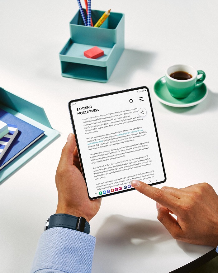 Galaxy Z Fold je bio predvodnik u transformaciji svakodnevne produktivnosti preko snažnog iskustva velikog ekrana, razvijajući se od Multi Window[14] i App Continuity[15] funkcija do širokog spektra mogućnosti uključujući Taskbar[16], opcije povlačenja i ispuštanja te optimizaciju aplikacija trećih strana. S Pen Fold Edition[17] olovka, predstavljena u trećoj generaciji Folda 2021. godine, takođe je dodatno prilagođena kako bi pružila izvanredno iskustvo pisanja na Galaxy Z Fold5 uređaju. Ove funkcije i alati spajaju se za pružanje snažne produktivnosti na velikom ekranu kako bi korisnicima omogućili obavljanje važnih zadataka gde god se nalazili.