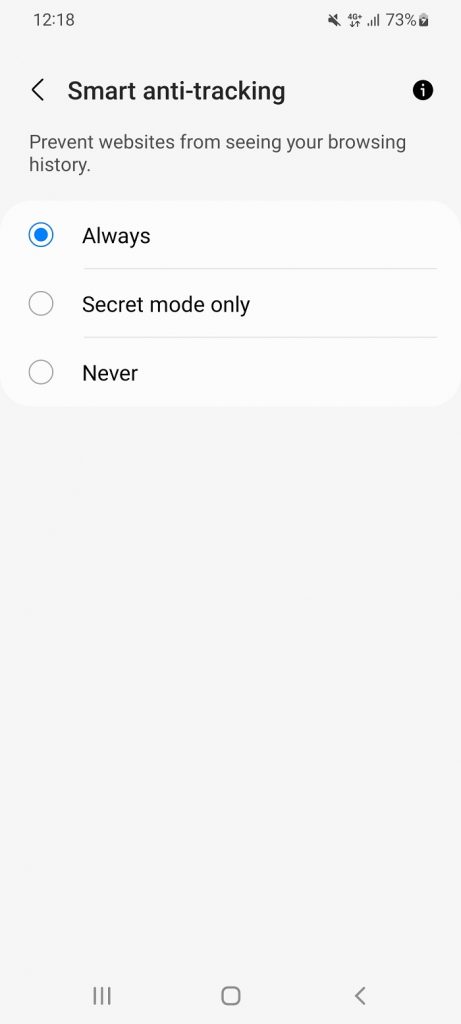 Samsung Internet 17.0 unapređuje inteligentnu Smart anti-tracking funkciju koja se sada može uključiti prema sopstvenim zadatim postavkama[2]. Ova pametna funkcija pomaže u blokiranju trećih strana koje pokušavaju da prate lične podatke korisnika, a za dodatnu zaštitu prilikom upisivanja željene URL adrese na Samsung pregledaču korisnici mogu da aktiviraju i bezbedniju HTTPS postavku.