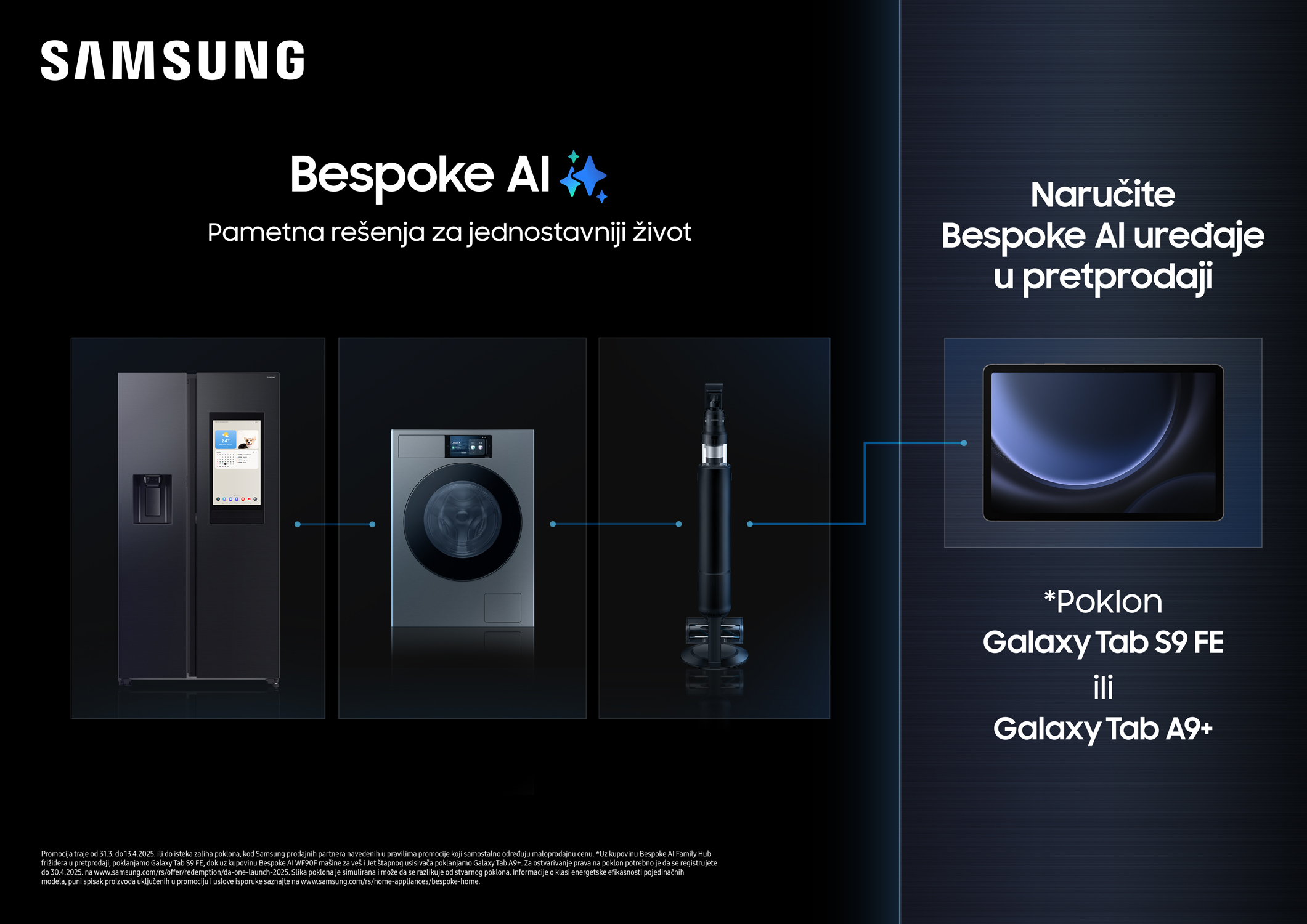 Izaberi pametno, kupi Bespoke AI uređaje u pretprodaji i uz registraciju na poklon možeš da dobiješ Galaxy Tab S9 FE ili Galaxy Tab A9+